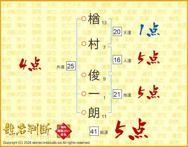 楢(13画)村(7画) 俊(9画)一(1画)朗(11画)