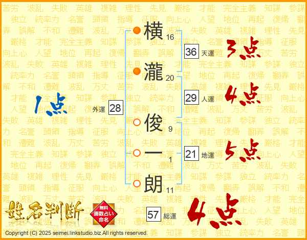 横(16画)瀧(20画) 俊(9画)一(1画)朗(11画)