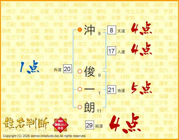 沖(8画) 俊(9画)一(1画)朗(11画)