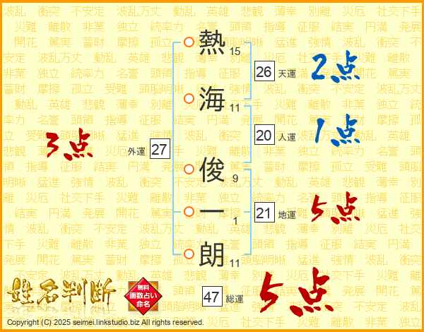 熱(15画)海(11画) 俊(9画)一(1画)朗(11画)