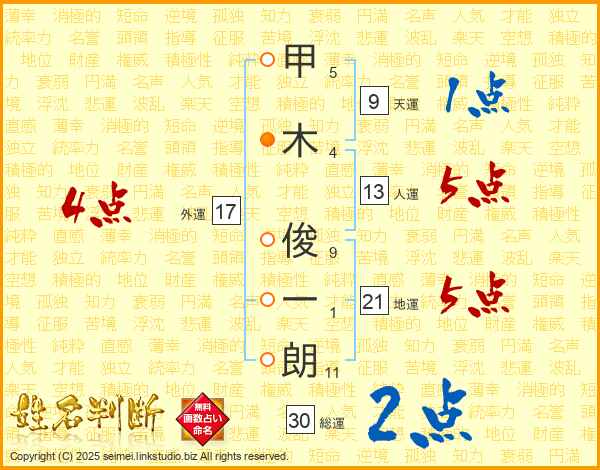 甲(5画)木(4画) 俊(9画)一(1画)朗(11画)