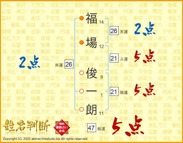 福(14画)場(12画) 俊(9画)一(1画)朗(11画)