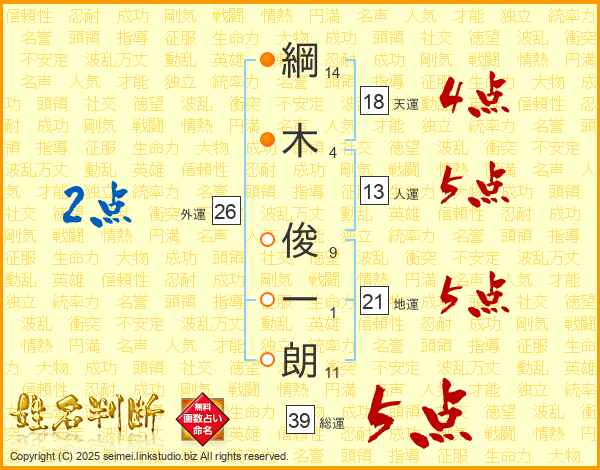 綱木俊一朗さんの総運は39画の5点!