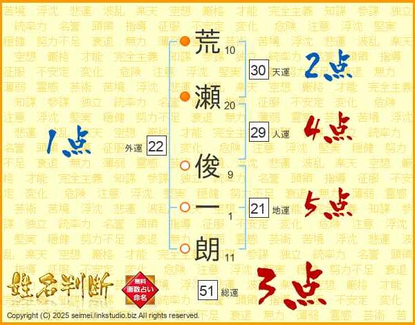 荒(10画)瀬(20画) 俊(9画)一(1画)朗(11画)