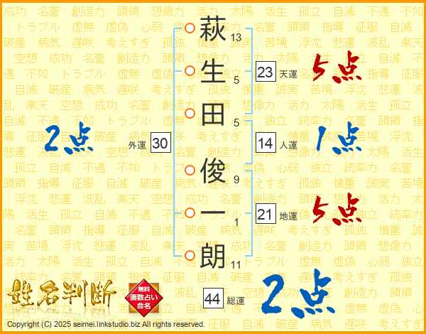 萩(13画)生(5画)田(5画) 俊(9画)一(1画)朗(11画)
