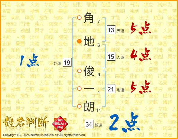 角(7画)地(6画) 俊(9画)一(1画)朗(11画)