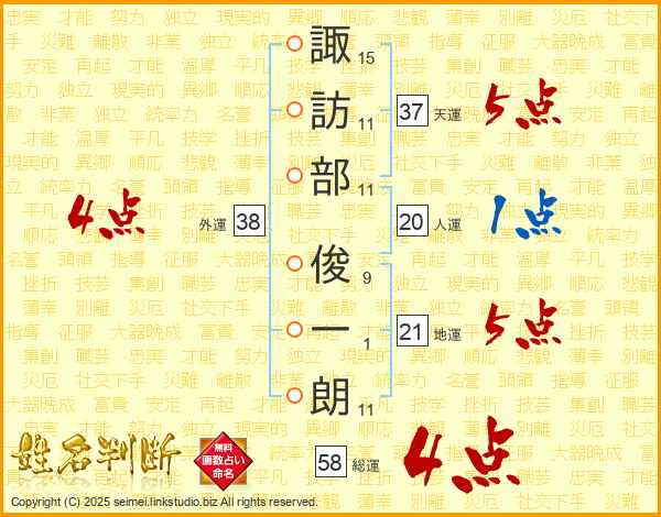 諏(15画)訪(11画)部(11画) 俊(9画)一(1画)朗(11画)