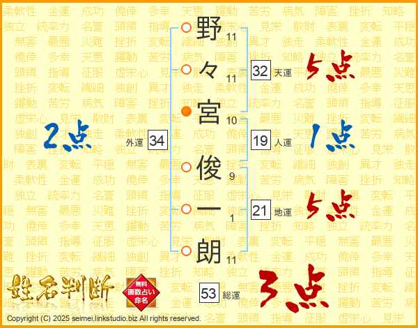 野(11画)々(11画)宮(10画) 俊(9画)一(1画)朗(11画)