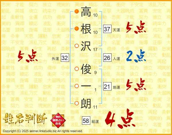 高(10画)根(10画)沢(17画) 俊(9画)一(1画)朗(11画)
