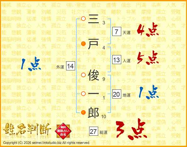 三(3画)戸(4画) 俊(9画)一(1画)郎(10画)