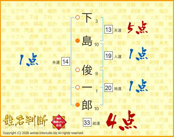 下(3画)島(10画) 俊(9画)一(1画)郎(10画)