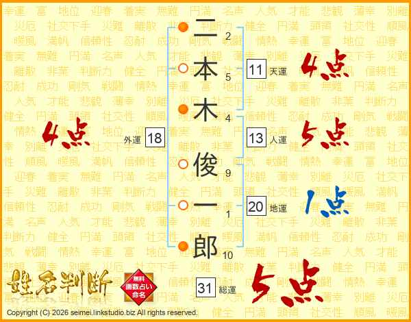 二(2画)本(5画)木(4画) 俊(9画)一(1画)郎(10画)