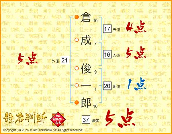 倉(10画)成(7画) 俊(9画)一(1画)郎(10画)