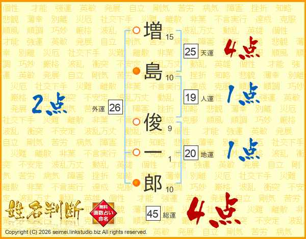 増(15画)島(10画) 俊(9画)一(1画)郎(10画)