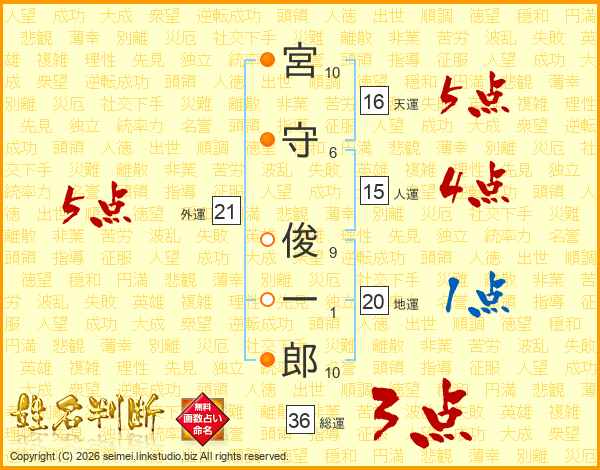 宮(10画)守(6画) 俊(9画)一(1画)郎(10画)