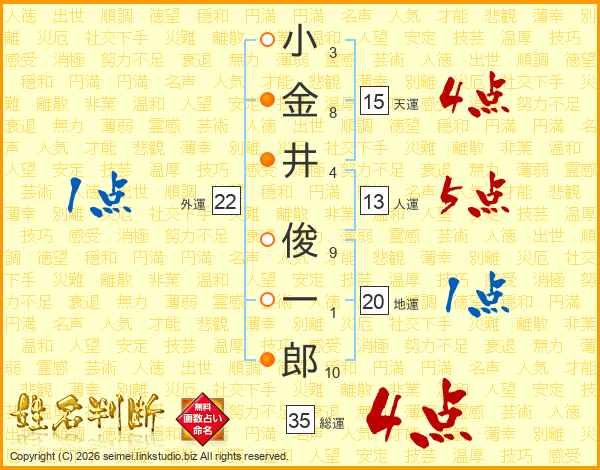 小(3画)金(8画)井(4画) 俊(9画)一(1画)郎(10画)