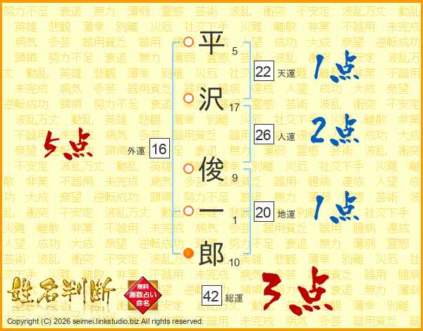 平(5画)沢(17画) 俊(9画)一(1画)郎(10画)