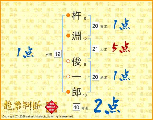 杵(8画)淵(12画) 俊(9画)一(1画)郎(10画)