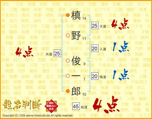 槙(14画)野(11画) 俊(9画)一(1画)郎(10画)