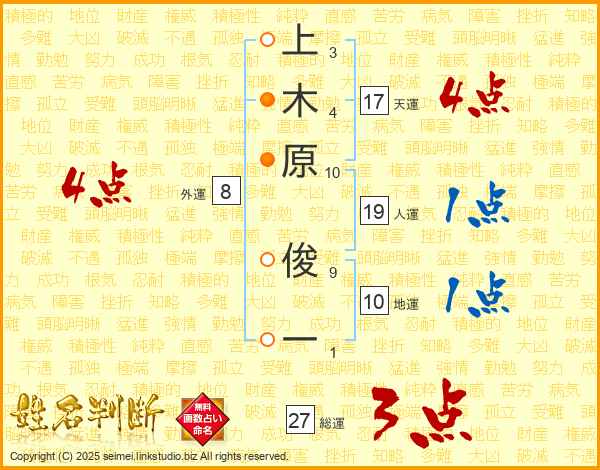 上(3画)木(4画)原(10画) 俊(9画)一(1画)