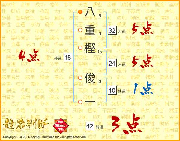 八(8画)重(9画)樫(15画) 俊(9画)一(1画)
