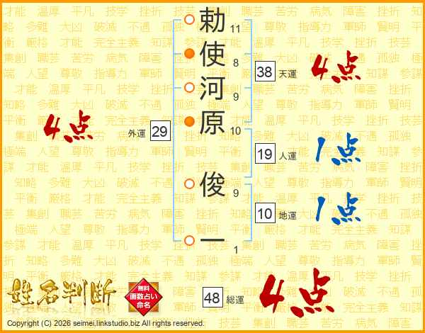 勅(11画)使(8画)河(9画)原(10画) 俊(9画)一(1画)