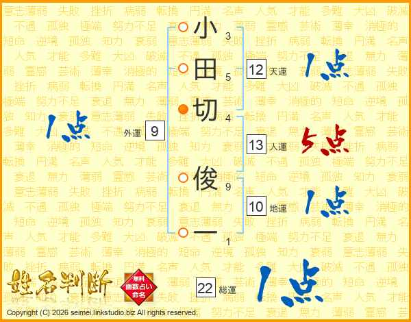 小(3画)田(5画)切(4画) 俊(9画)一(1画)