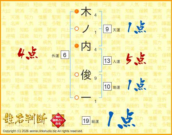 木(4画)ノ(1画)内(4画) 俊(9画)一(1画)