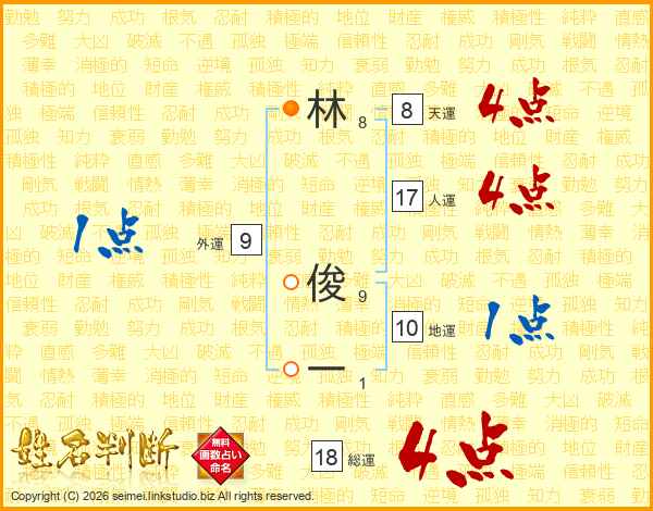 生活面を象徴する運勢です。外部から受ける影響力を表し、結婚運、家庭運や職場、環境への順応性を表します。総運から人運を引いた画数。姓や名が1文字の場合を除く。