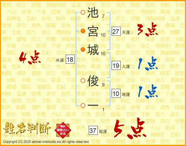 池(7画)宮(10画)城(10画) 俊(9画)一(1画)