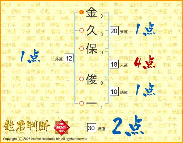 金(8画)久(3画)保(9画) 俊(9画)一(1画)