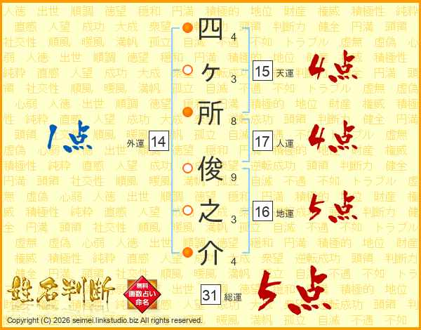 四(4画)ヶ(3画)所(8画) 俊(9画)之(3画)介(4画)