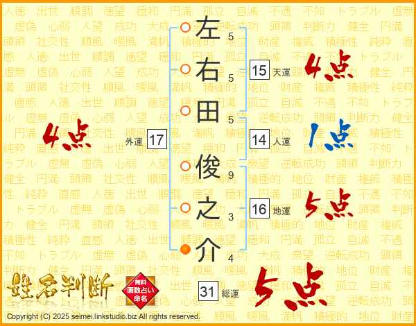 左(5画)右(5画)田(5画) 俊(9画)之(3画)介(4画)