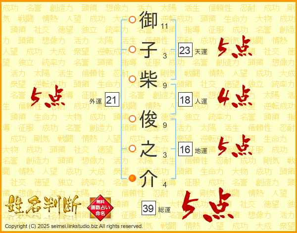 御(11画)子(3画)柴(9画) 俊(9画)之(3画)介(4画)