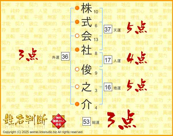 株(10画)式(6画)会(13画)社(8画) 俊(9画)之(3画)介(4画)