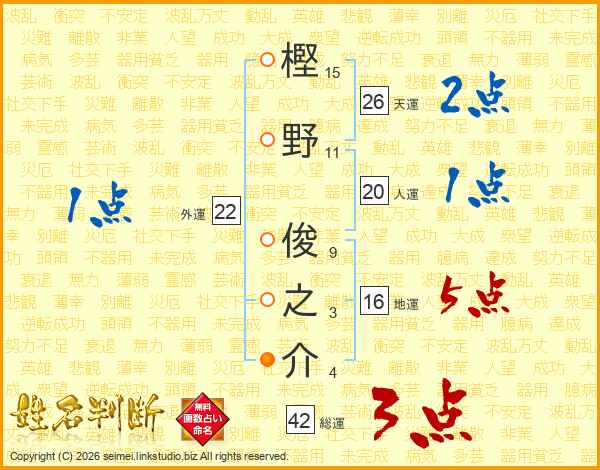樫(15画)野(11画) 俊(9画)之(3画)介(4画)
