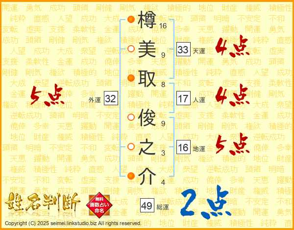 樽(16画)美(9画)取(8画) 俊(9画)之(3画)介(4画)