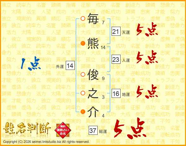 毎(7画)熊(14画) 俊(9画)之(3画)介(4画)