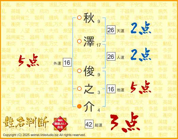 秋澤俊之介さんの総運は42画の3点!