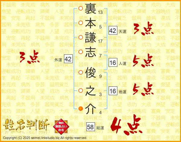 裏(13画)本(5画)謙(17画)志(7画) 俊(9画)之(3画)介(4画)