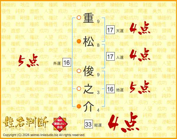 重(9画)松(8画) 俊(9画)之(3画)介(4画)