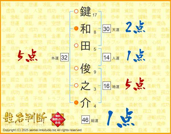 鍵(17画)和(8画)田(5画) 俊(9画)之(3画)介(4画)