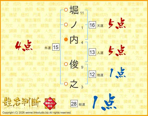 堀ノ内俊之さんの総運は28画の1点!