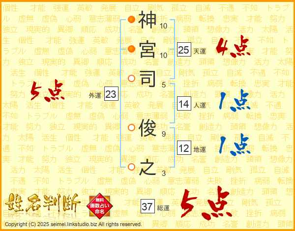 神(10画)宮(10画)司(5画) 俊(9画)之(3画)