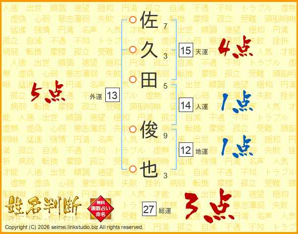 佐久田俊也さんの総運は27画の3点!