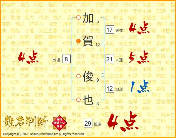 あなたの人生を表す1番重要な運勢です。生涯を通じて影響する総合運となり、主に50歳以降の晩年期に影響を及ぼします。苗字と名前の合計画数。