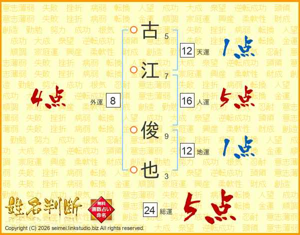 あなたの人生を表す1番重要な運勢です。生涯を通じて影響する総合運となり、主に50歳以降の晩年期に影響を及ぼします。苗字と名前の合計画数。