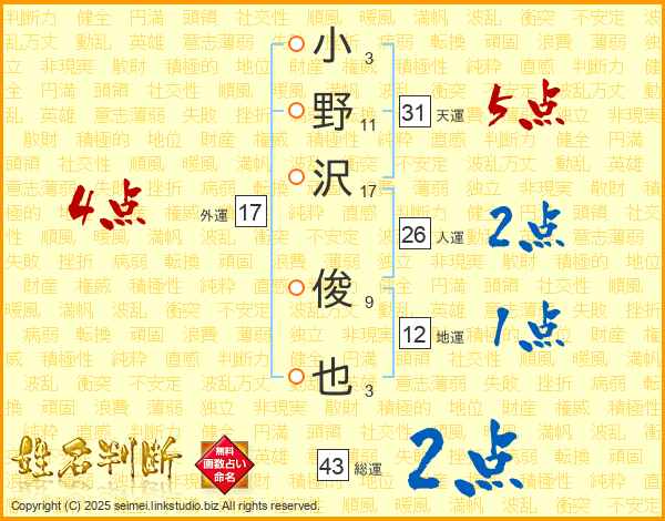 小野沢俊也さんの総運は43画の2点!
