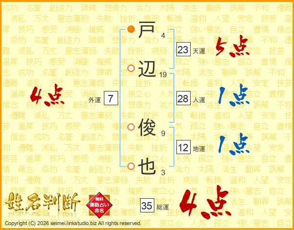 戸(4画)辺(19画) 俊(9画)也(3画)