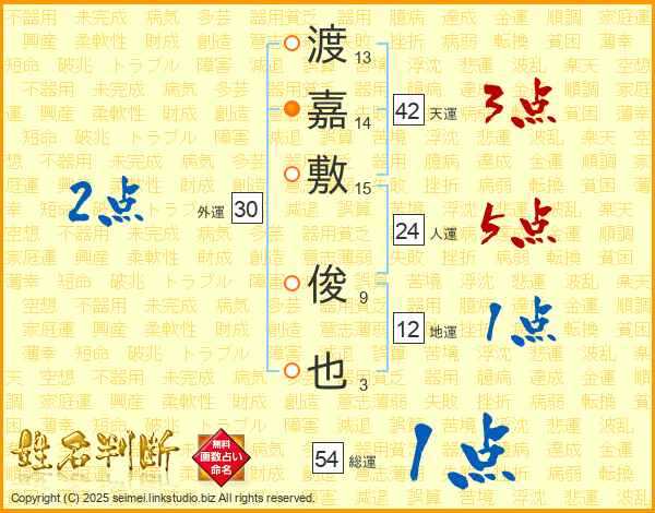 渡(13画)嘉(14画)敷(15画) 俊(9画)也(3画)